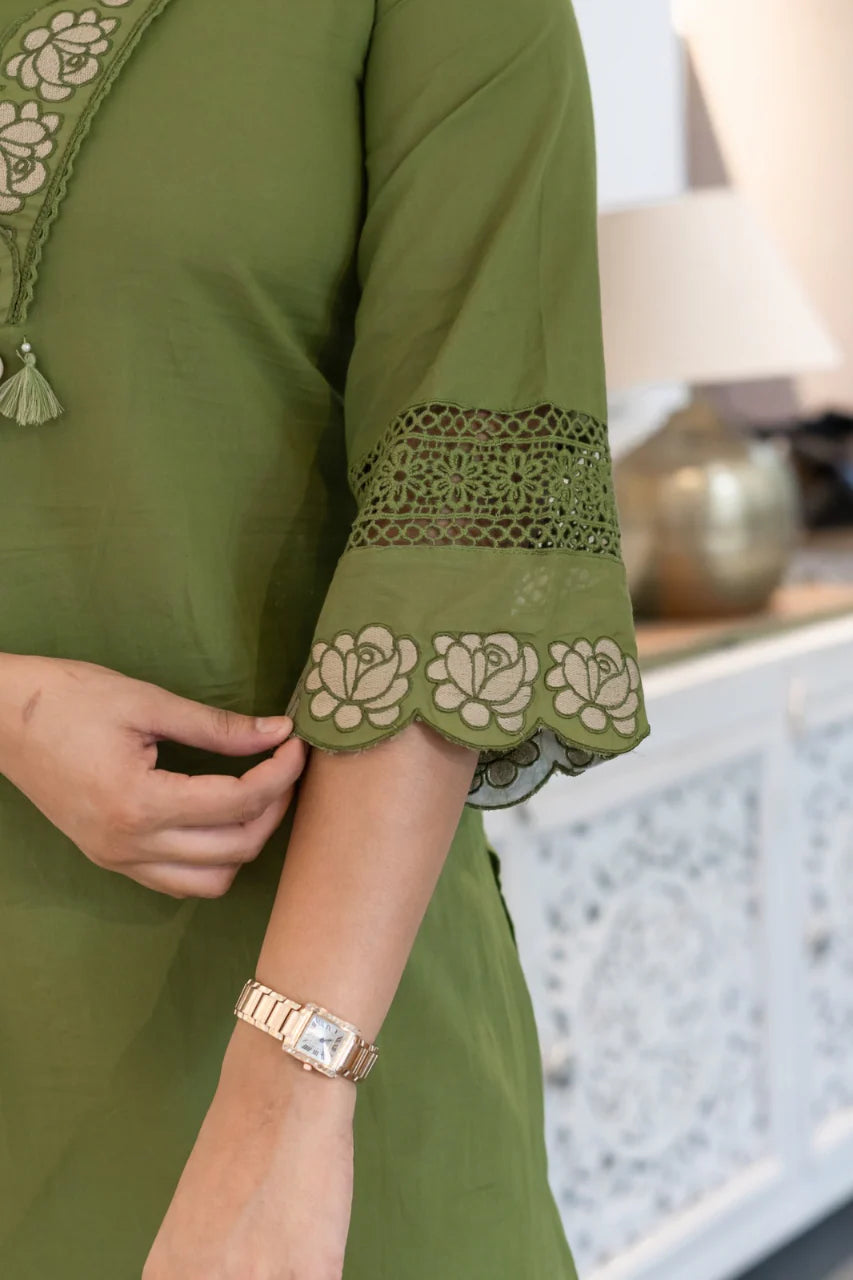 Green Gazal Premium Cotton Embroidered Kurta Pant Set