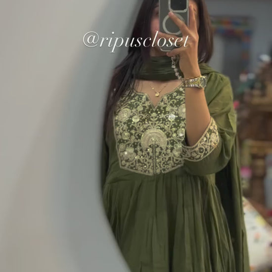 Embrace timeless elegance with this stunning olive green Anarkali kurta set! The intricate embroidery adorns the kurta with traditional artistry, while the flowing silhouette flatters every frame. Paired with a coordinating dupatta, this ensemble effortlessly transitions from festive celebrations to everyday sophistication. The rich olive hue complements all skin tones, making it a versatile wardrobe essential. Perfect for weddings, parties, or when you want to feel absolutely radiant in authentic ethnic wear.
